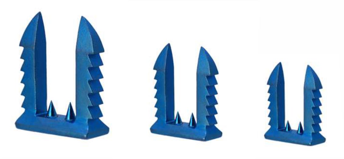 - Tapered, sharp legs allow for easy insertion into dense cortical bone with minimal